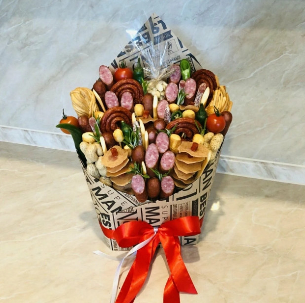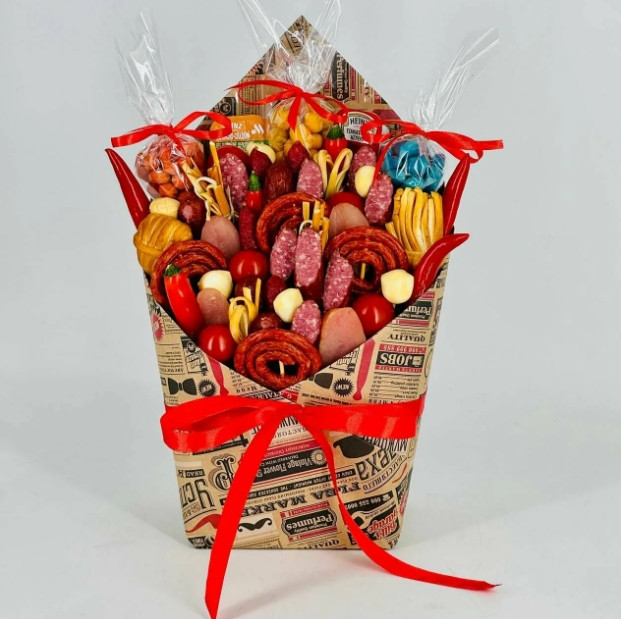 Такой подарок моментально решает вопрос праздничной закуски. Он выглядит внушительно, пахнет аппетитно и сразу создаёт неформальную, дружескую атмосферу. Это не просто еда, а целое событие в одной упаковке.Такой букет даёт возможность попробовать сразу много разных вкусностей.