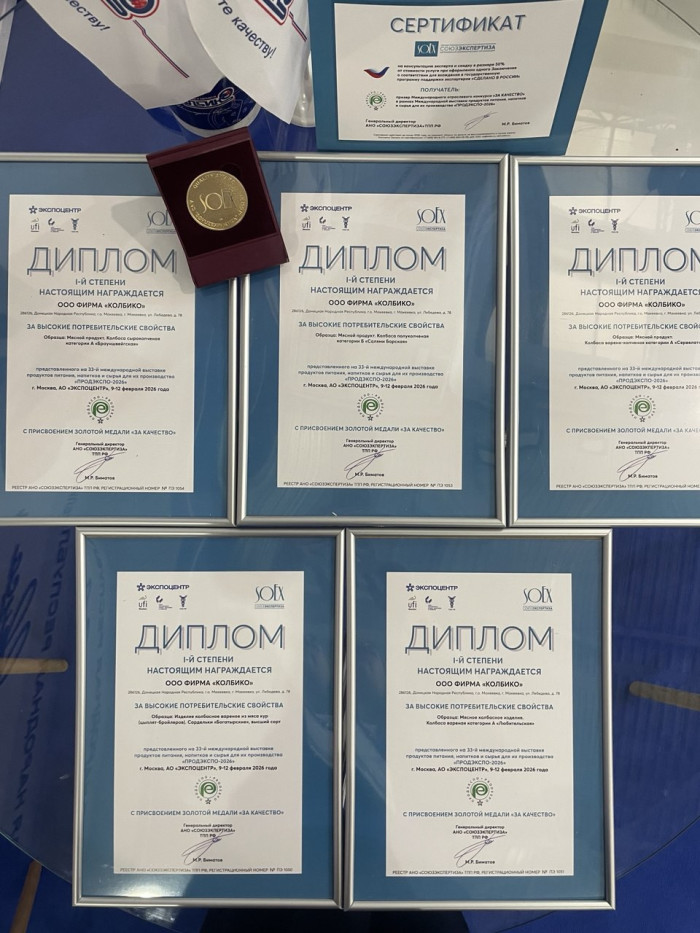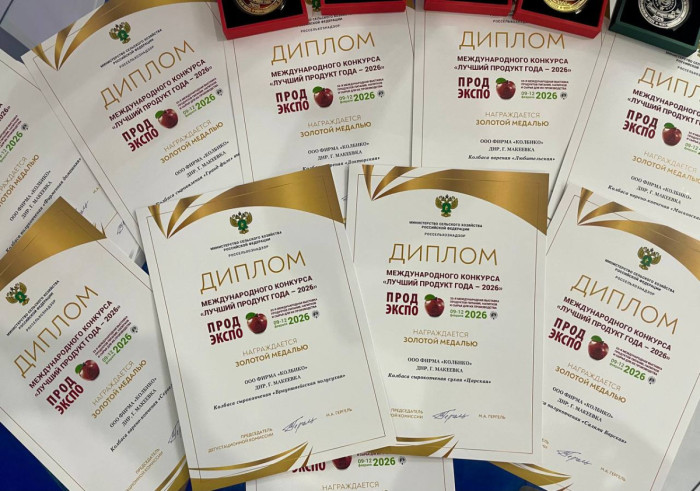 На Международной выставке «ПРОДЭКСПО – 2026» ФИРМА «КОЛБИКО» получила ЗОЛОТУЮ медаль и 5 дипломов ПЕРВОЙ степени в конкурсе – «За высокие потребительские свойства товаров».